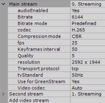 In most cases, the following parameters are set for video streams: bitrate, compression rate, frame rate, and resolution. Detailed information on configurable parameters can be found in the official reference documentation for the camera.