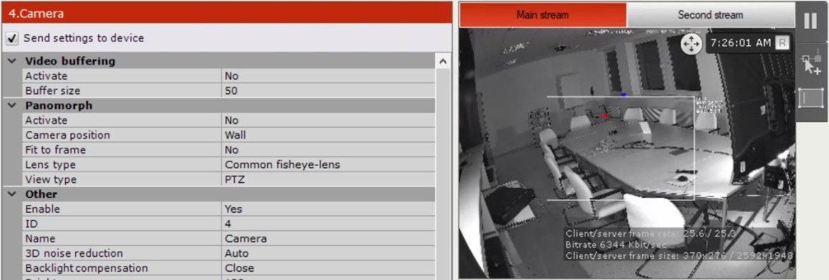 You can configure video streams below the Surveillance window. If a camera supports multistreaming, you can configure two video streams separately: Main stream and Second stream. If necessary, you can configure additional video streams using the Add video stream field. When creating an IP device with a main video stream, a stream with a higher resolution is selected. To configure video streams, you should make sure that the Send settings to device checkbox is set.