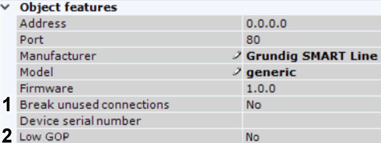 2. After starting the Client, the default setting is to display video only after the first I-frame (key frame) is received. If the stream comes with a relatively long GOP length (Group of Pictures) or GOV length (Group of Video Object Planes), i.e. the number of P- and B-frames between I-frames in the stream, the video may be not available for a minute. In this case, select Yes for the Low GOP keyframe rate setting (2). This will reduce the waiting time for video by pushing the preceding I-frame that can be stored in the memory buffer on the Server. In some cases, the I-frame will not be buffered, but in most cases this means that it will soon be received from the device.