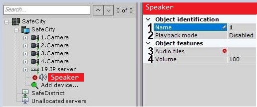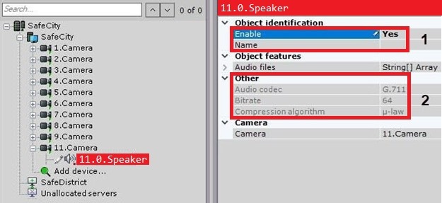 By default, IP device speakers are disabled. To enable, for the Enable value (1), select Yes. When configuring the speaker of an IP device, you can set other parameters as well, such as the compression algorithm for the audio signal sent to the speaker for playback (2). Which speaker parameters you can configure is determined by the protocol for integration of the IP device and the C-Werk software package.