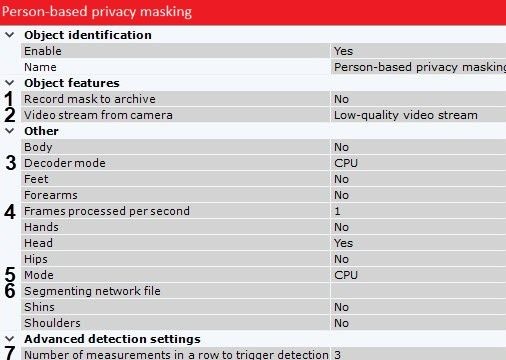 Selected body parts of all individuals within FOV will be hidden from view. For a user group with limited rights to view masked video (see Creating and configuring roles), the mask is displayed on the video image of the selected camera in the Detection Tools and Hardware sections, on the layouts, in the archive and when exporting. For the admin user group, the mask is displayed only on the video image of the selected camera in the Detection Tools and Hardware sections, and when exporting, if the View masked video checkbox is clear (see Standard video recordings export).