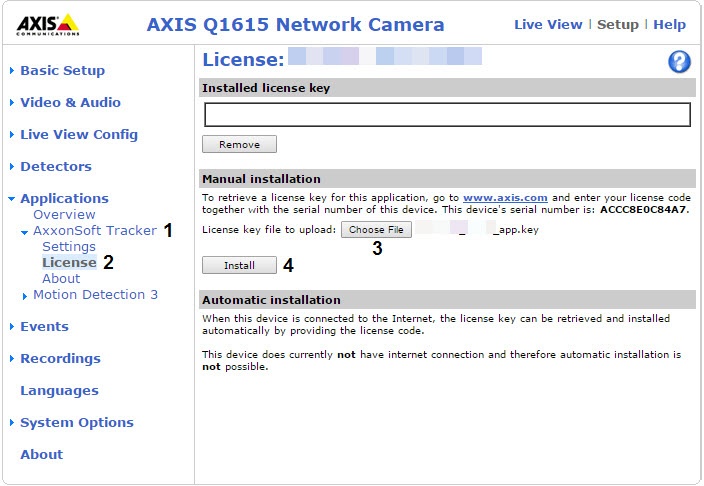 For application, contact Grundig. You will be given a license code that you must register along with camera's MAC address on Axis website in order to get the license file.