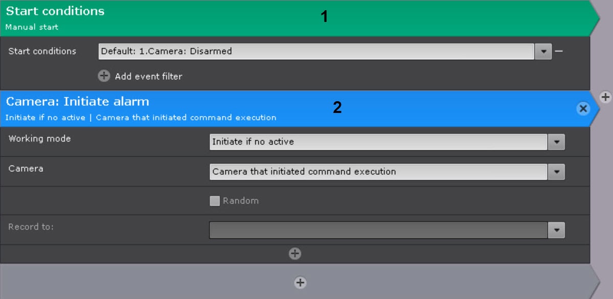 1. Specify the green section of the setting Start conditions (1). These are the events in the system that will trigger a macro (see Configuring filters for event-driven macros).