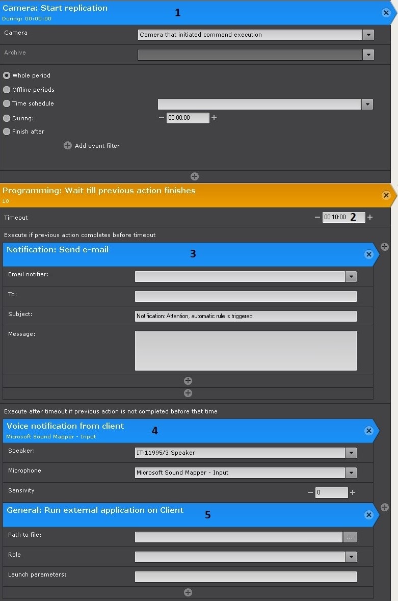 For example, when performing that macro, an alarm will be initiated in the system (1), and then after 10 seconds (2)—an audio alert (3).