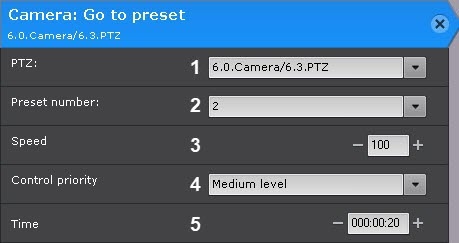 Set time (5). If the macro is running and the user has a lower access level than the macro, the user will be able to control the PTZ camera only after this time has elapsed.