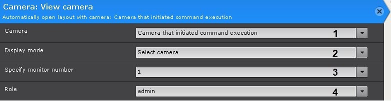 Select the camera to be displayed (1) or Camera that initiated command execution (see Configuring filters for event-driven macros). You can select a group of cameras for the Switch to archive mode (see step 2).