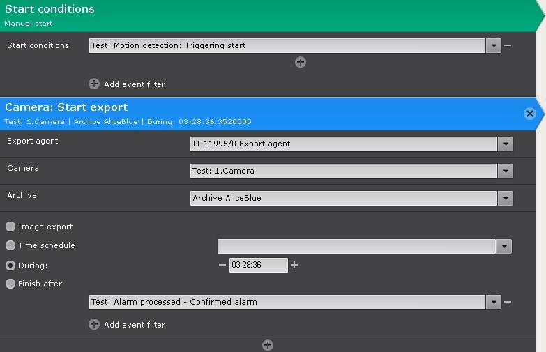 This action starts the export of a snapshot or a video. You must configure the conditions to start a macro beforehand (see Configuring filters for event-driven macros).