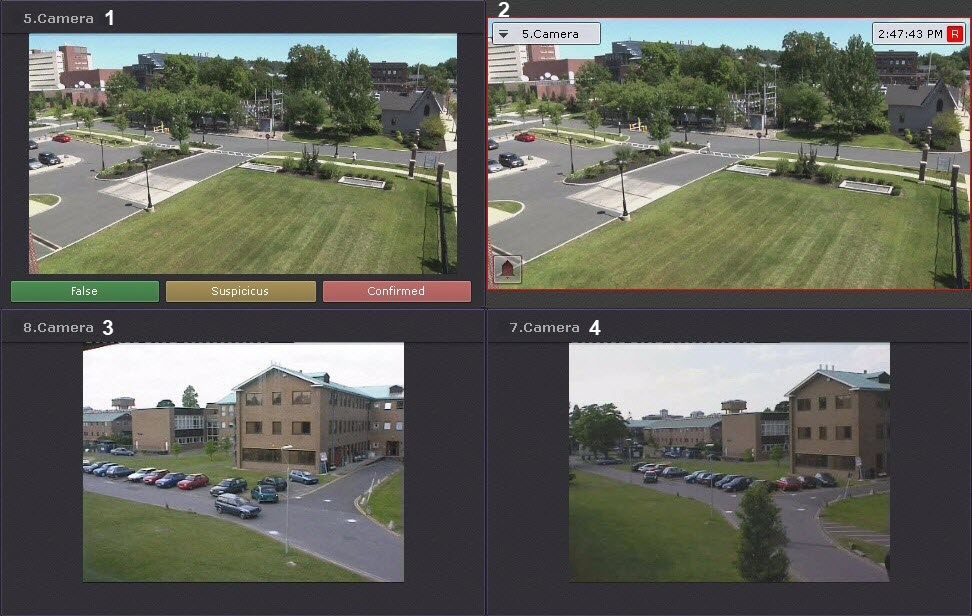 - 2 additional cameras (3, 4) in Live Video mode (for example, the 2 nearest ones to the alarmed one).