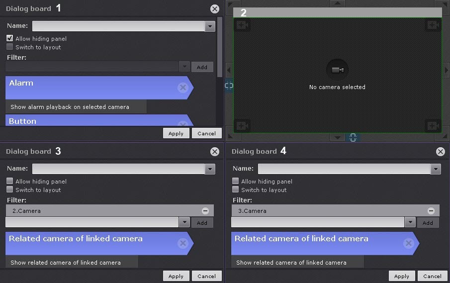 - In the third and fourth cells, add a message panel with Related camera of linked camera (3, 4).