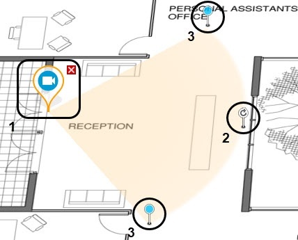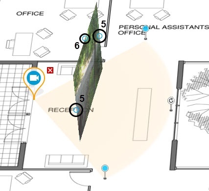 1. Drag the video camera's icon to the place on the map that represents the camera's actual location at the site (1).