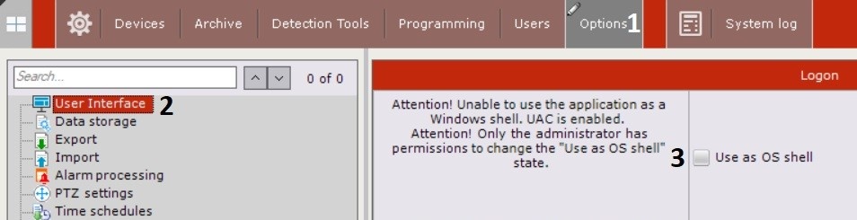 To activate autorun of the C-Werk software package instead of the standard Windows shell, select the Use as OS shell (3) check box in Settings → Options → User Interface (1-2) and click Apply.