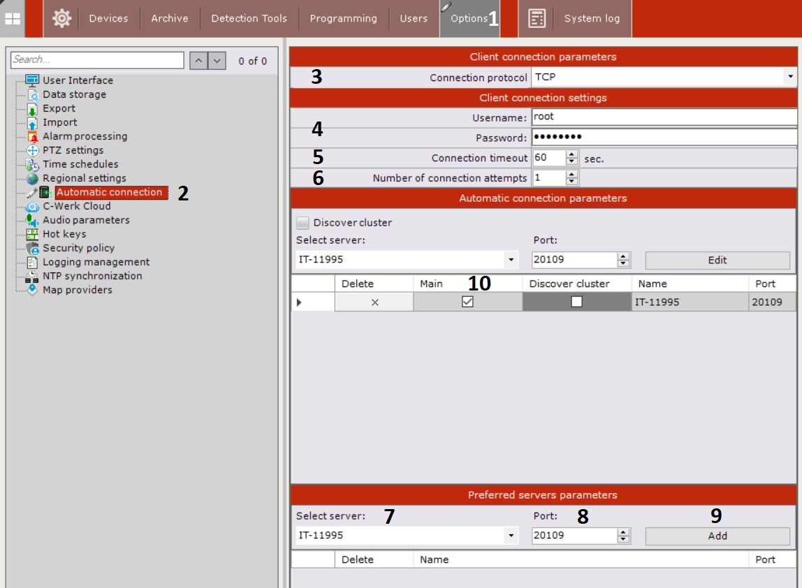 2. Configuring the protocol used by Clients to connect to the Server allows prioritizing reliability or speed of data transmission (3).The connection protocol is set individually for each Server in an Domain. All Clients connected to the Server will receive video streams over the selected protocol.