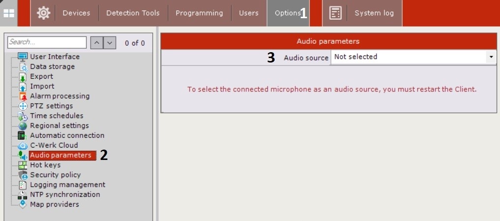 To broadcast audio from the Client microphone on a camera speaker, you must configure audio on the Client.