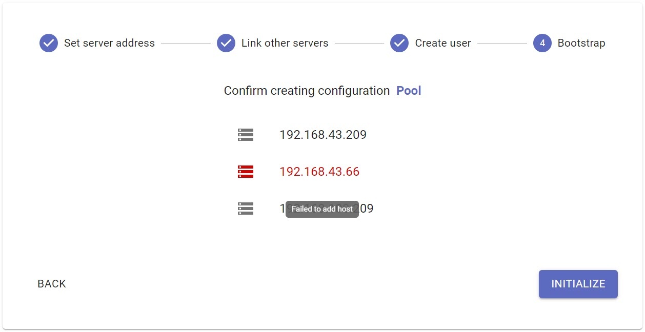 If during the process of cluster creation, you added the Server that were already added to another cluster, they will be unavailable. If you try to initialize the cluster with unavailable Servers, they will be marked red, and the cluster won't be initialized.