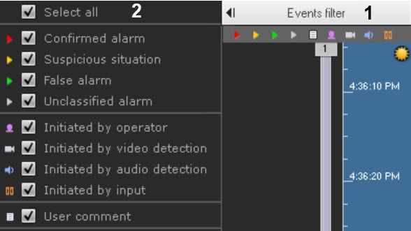 To display alarms on the timeline, select at least one type of alarm event and one initiator.