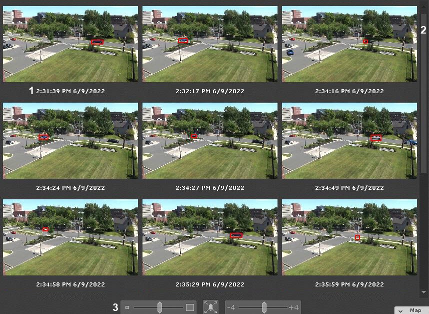 The search results panel displays the precise moments in an archive that correspond to the defined search criteria. The precise time of each moment is displayed under it (1). The found results are the beginning of video recordings.