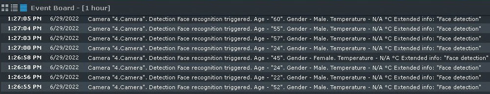 If you activate the age and gender information collection, its results will be displayed on the panel and saved into the System Log (see Configuring Face detection).