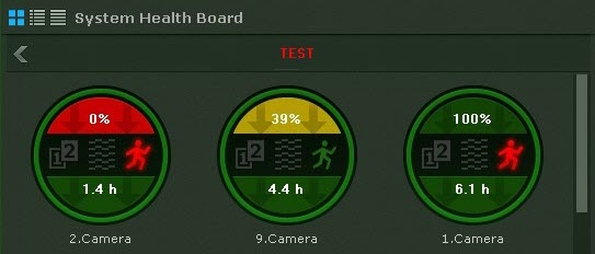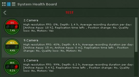 Information about the status of cameras can be displayed in three ways, chosen via the buttons in the upper-left corner of the board: