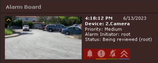 Each alarm event is displayed on the Alarm Board as follows: an alarm event window with the first frame of the event, additional information about the alarm event, an event priority icon and the buttons for quick assessment of the alarm event.