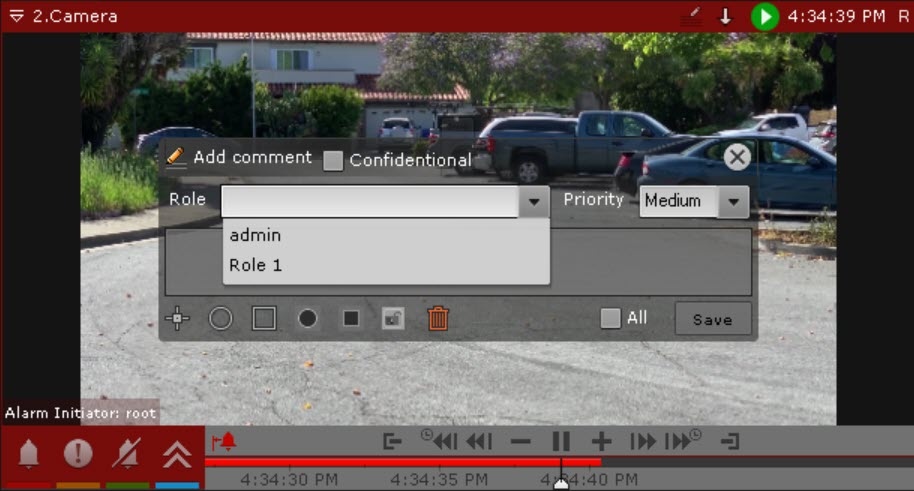 To escalate an alarm, click the button. A window will open, in which it is possible to set the area of visibility for the roles whose users can see the alarm, as well as change the alarm priority for the selected role. When displayed on the Alarm Board, the higher the priority of the alarm, the higher it will be located in the alarms list.
