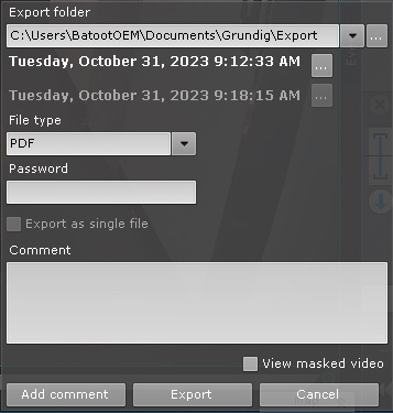 The supervisor enters their password only if it is required by user role settings (see Creating and configuring roles). If no export confirmation is required, these fields will not be displayed.