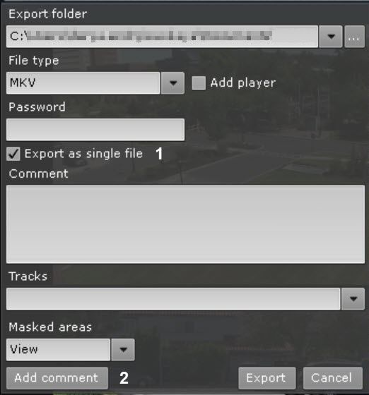 By default, the video is exported to a single file. To export video from different video cameras to separate files, clear the Export as single file checkbox in the export window (1).