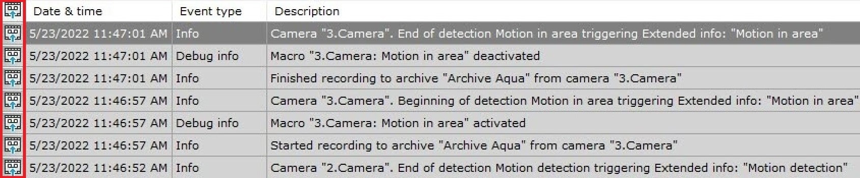 To switch to archive video of specific events, click the  icon next to the event or double-click the relevant row.