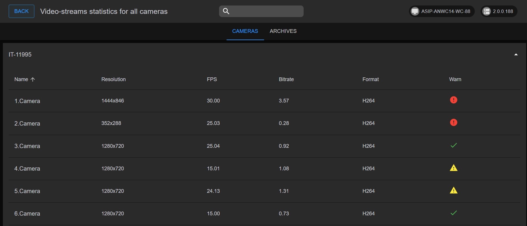 On the CAMERAS tab, the following parameters are displayed for each video stream of each camera: