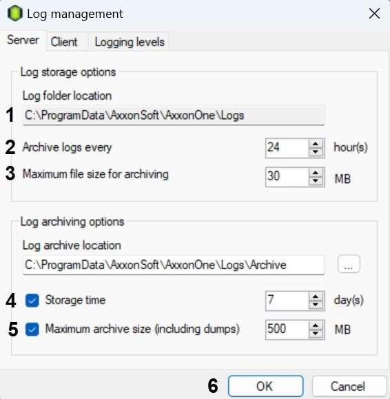 5. In the Maximum archive size (including dumps) field (5), set the maximum size of the archive, above which the earliest logs are deleted from the archive.