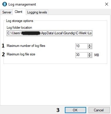 - Set the maximum size of logs in megabytes (2). When the specified size is reached, a new file with logs is created.