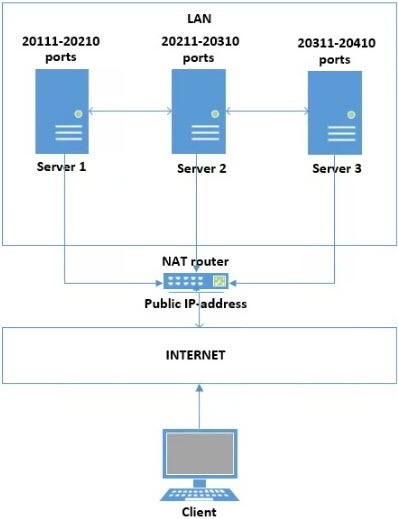 3. The router ports 20311-20410 to the internal IP address of the Server 3 and ports 20311-20410.