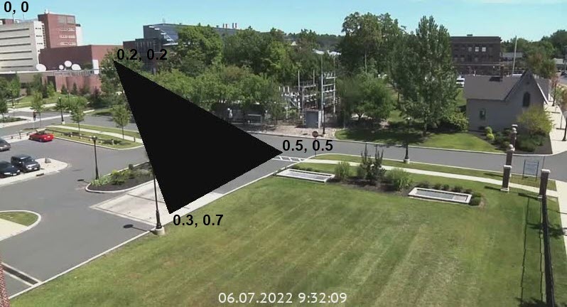 | maskspace | Area | A frame area for masking, set in coordinates. By default a frame is not masked. The area is specified by at least 3 anchor points + 1 terminal point (coincides with one of the anchor points). The reference point is the upper left corner. You can specify multiple polygons. Image example: | "maskspace": [