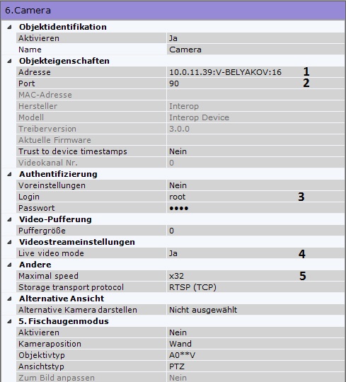 4. Geben Sie die Adresse des Gerätes im folgenden Format an (1): <IP-Adresse des lokalen Servers>:<Name des lokalen Servers in der C-Werk-Domain>:<ID der Kamera auf dem Server>.