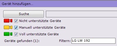 - Nach Hersteller, Gerätemodell und IP-Adresse. Dazu wird das Feld Filter verwendet. So belässt dieser Filter beispielsweise Geräte von LG in der Liste, derer Modellbezeichnung die Buchstabenkombination LW enthält und deren IP-Adresse die Zahlenfolge 192 enthält.