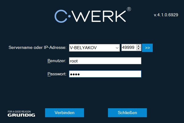 Die Softwareplattform C-Werk wird daraufhin gestartet, und es erscheint das Autorisierungsfenster. - Geben Sie Benutzernamen und Passwort ein, und klicken Sie auf Verbinden.