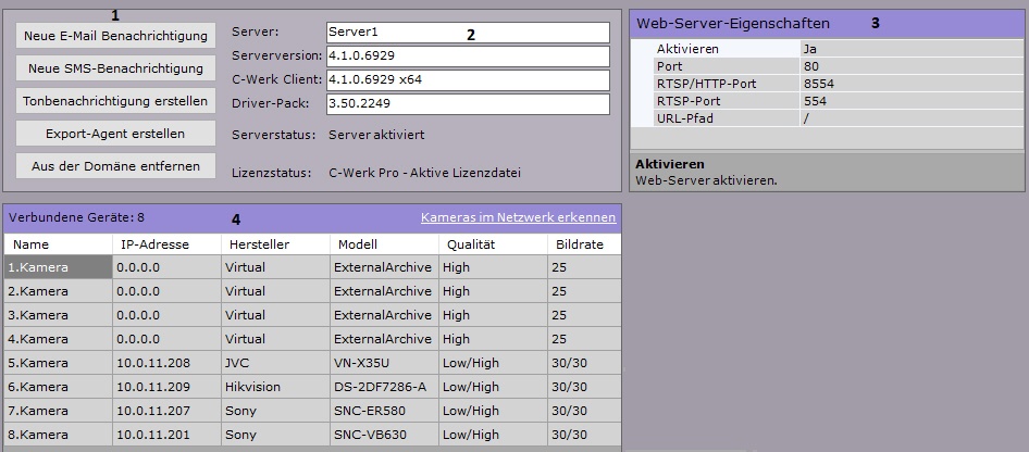 Bei Wahl des Objekts Server erscheint eine Benutzeroberfläche, die folgende Elemente enthält: