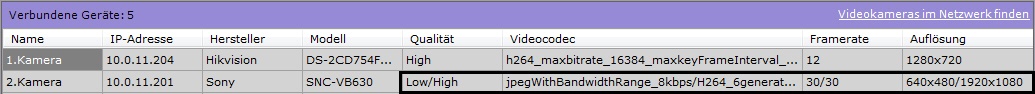 Die Kameraliste liegt in Form einer Tabelle mit folgenden Spalten vor: Objektname, IP-Adresse, Hersteller, Modell, Videostreamqualität, Videocodec, Framerate und Auflösung.