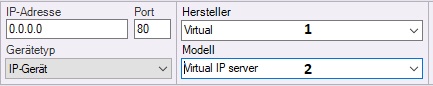 1. Fügen Sie mit Hilfe des Suchmasters für IP-Geräte die Kamera hinzu, und wählen Sie im Feld Virtual (1, vgl. Erstellen und Entfernen von IP-Geräten).