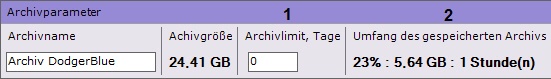 Im Feld Umfang des aufgezeichneten Archivs wird das belegte Archivvolumen in Prozent angezeigt (2).