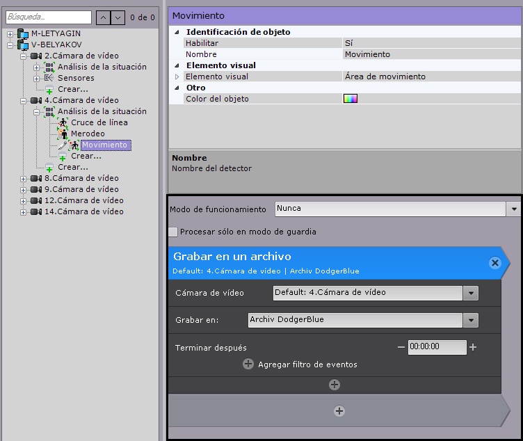 Cuando crea la regla automática de Iniciar la grabación en el archivo, la grabación se detiene cuando se detiene la activación de VMD (véase Detectores de análisis de situación).