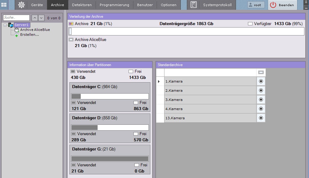 - Aufzeichnung des Videostreams der Videokameras in die Archive einrichten.